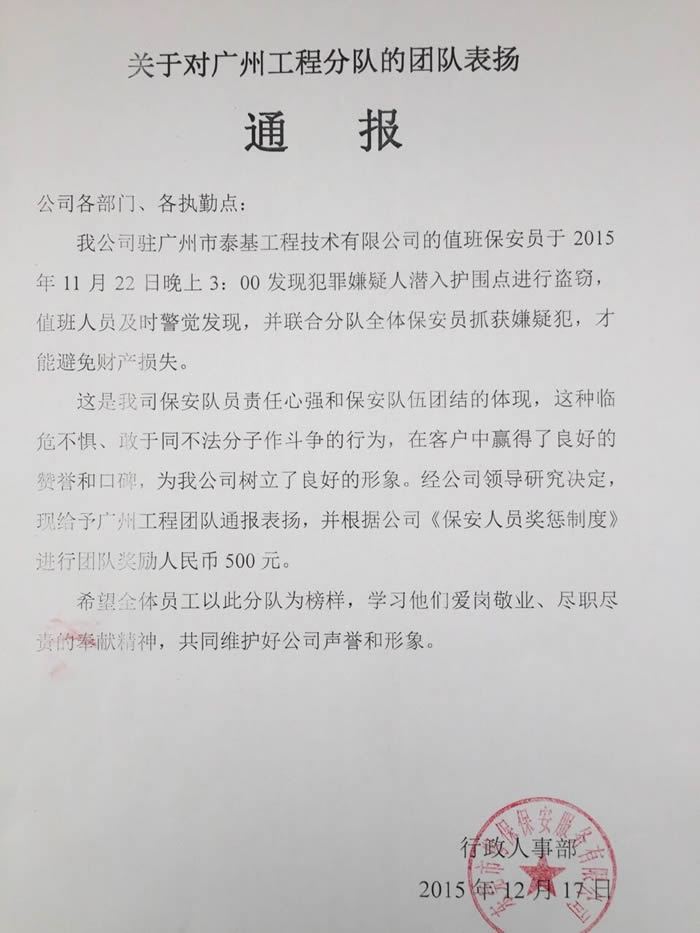 這是我司保安隊員責任心強和保安隊伍團結的體現,這種臨危不懼、敢于同不法分子作斗爭的行為,在客戶中贏得了良好的贊譽和口碑,為我公司樹立了良好的形象。經公司領導研究決定,現給予廣州工程團隊通報表揚,并根據公司《保安人員獎懲制度》進行團隊獎勵人民幣500元。
